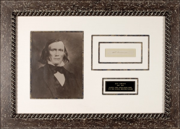 American scout and soldier (1809–1868) who takes a place among the most colorful personalities in the Old West. After spending more than a decade as trapper, Carson joined John Frémont’s western expeditions in the early 1840s as a scout, in which capacity his experience as a frontiersman saved the party from starvation during a particularly harrowing winter. Carson fought under Kearny during the Mexican-American War and, during the Civil War, served as Colonel of Volunteers of the New Mexico infantry. Following the war, after a number of notable campaigns against the Confederates and various Indian tribes, Carson became a rancher in Colorado, where he died of an aneurysm at the age of fifty-eight. Scarce ink signature, “Kit Carson,” on an off-white 3.75 x .5 slip affixed to a larger slip. Handsomely matted and framed with a photo and engraved plaque to an overall size of 26 x 18.75. Accompanied by a PSA/DNA LOA. In fine, bright condition. R&R COA.