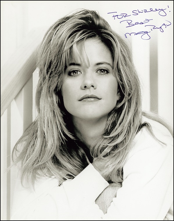 Satin-finish 8 x 10 head-and-shoulders photo, signed and inscribed in blue felt tip “For Shirley! Best, Meg Ryan.” In very fine condition. R&R COA.