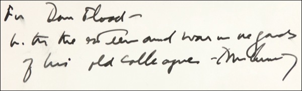 Impressive vintage matte-finish 11 x 14 photo of Kennedy seated at a desk, boldly signed and inscribed in fountain pen in the blank lower border, “For Dan Flood—With the esteem and warm regards of his old colleague, John Kennedy.” Daniel J. Flood (1903–1994), a longtime and widely respected Pennsylvania politician, was a colleague of Kennedy’s in the House of Representatives. The two became close associates and personal friends, and when Kennedy ran for the presidency, Flood convinced him to campaign in his home district—and, indeed, Pennsylvania was one of the crucial states that Kennedy carried in that legendarily close election. In the latter stage of his career, Flood was censured by the House on charges of bribery, leading to his resignation in 1980. Archivally suede matted and framed to an overall size of 18 x 21. A few spots of subtle soiling, and light brushes to a few words of inscription, otherwise fine condition. While all signed photos of Kennedy are highly desirable, examples of this size are quite elusive. Auction LOA John Reznikoff/PSA/DNA and R&R COA.