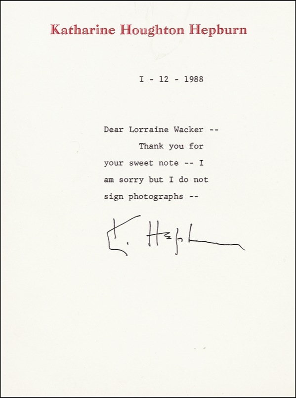 Two items: 1988 TLS on personal letterhead, her typical terse refusal to sign a photo, signed with her elderly “K. Hepburn”; and her unsigned credit card–style membership card in the Columbia House Video Club, bearing her embossed name, circa 1992. In fine condition. R&R COA.