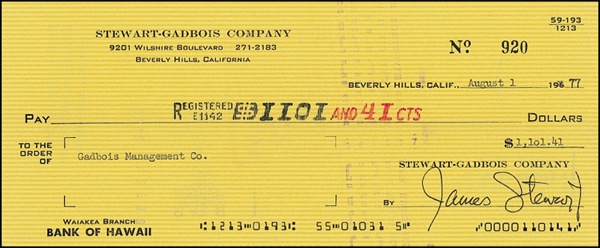 Business check, 8.5 x 3.5, filled out in type and signed by Stewart, payable to Gadbois Management Co. for $1101.41, August 1, 1977. In fine condition, with bank stamps to both sides and a clean signature area. R&R COA.