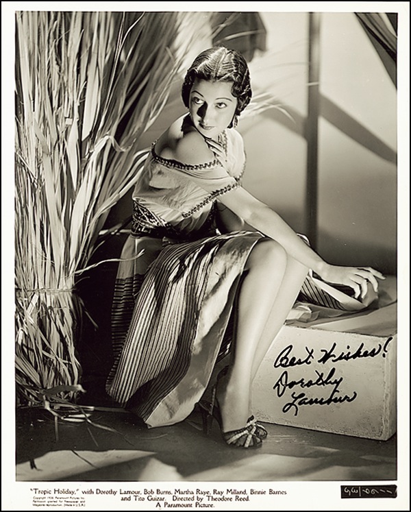 Original glossy 8 x 10 publicity photo from the 1938 film Tropic Holiday, signed later in black felt tip, “Best wishes! Dorothy Lamour.” A few minor dings and faint bends, otherwise fine, fresh condition. R&R COA.