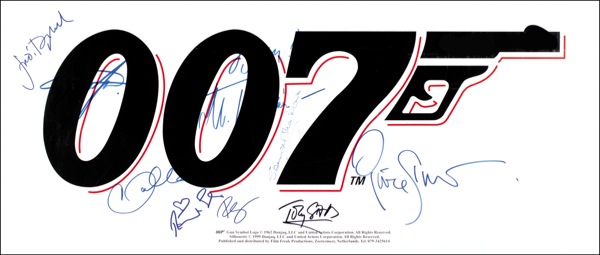 Color 27 x 11.5 poster of the 007 logo, signed in blue felt tip by Die Another Day cast members Pierce Brosnan, Halle Berry, Toby Stephens, Rosamund Pike, Samantha Bond, Rick Yune, Judi Dench, Ian Pieri, and Michael Gorevoy. Rolled and in fine condition, with some scattered light creasing. R&R COA.