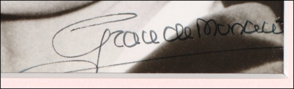 Matte-finish 6 x 8 photo of Kelly in a jacket and hat, signed in black ink, “Grace Kelly.” Double cloth matted with an unsigned portrait and a name plaque, to an overall size of 21.5 x 18.5. In fine condition, with some scattered light silvering to background. R&R COA.