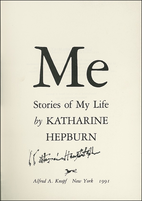 Signed book: Me. NY: Alfred A. Knopf, 1991. Hardcover with dustjacket, 6.75 x 9.5, 418 pages. Signed on the title page in black ink, “Katharine Houghton Hepburn.” Accompanied by a 1999 TLS from Hepburn’s assistant Christiane McCloskey, acknowledging the signature. In fine condition, with signature a bit difficult to read due to Hepburn’s advanced age at time of signing. PSA/DNA Auction LOA and R&R COA.