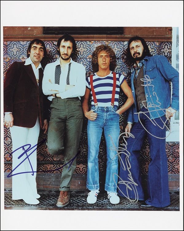 Color glossy 8 x 10 group photo, signed in silver ink by Roger Daltrey and John Entwistle and in blue felt tip by Pete Townshend. Accompanied by a photo of each band member from the private signing. In very fine condition. COA Roger Epperson/REAL and R&R COA.
