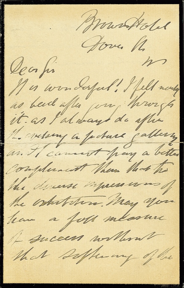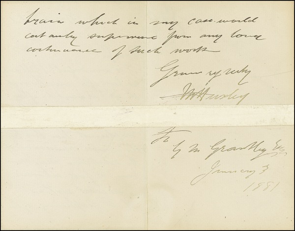 British biologist (1825–1895) who was an early and vocal advocate of Darwin’s theories and who coined the term “agnosticism.” ALS signed “T. H. Huxley,” three pages on two adjoining sheets, 3.5 x 5.75, black-bordered stationery, January 3, 1881. Huxley writes to G. M. Grantley. In part: “I felt nearly as bad after going through it as I always do after … a picture gallery…. May you have a full measure of success without that suffering of the brain….” In very good condition, with scattered soiling and complete horizontal separation with early tape repair. R&R COA.