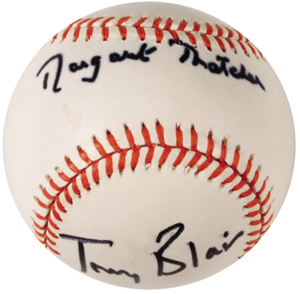 Official Rawlings American League Cal Ripken, Jr. commemorative baseball signed in felt tip on the sweet spot by Margaret Thatcher and on a side panel by Tony Blair. In fine condition, with some light spreading to both signatures resulting in a slightly fuzzy appearance. R&R COA.