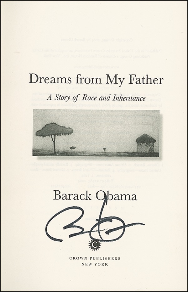 African-American senator from Illinois (born 1961) pegged as one of the rising stars of the Democratic Party. In January 2007, he announced his candidacy for the 2008 Democratic presidential nomination. Signed book: Dreams from My Father. First edition of the reissue. NY: Crown Publishers, 2004. Hardcover with dustjacket, 6.5 x 9.5, 442 pages. Signed in black felt tip on the title page. In very fine condition. R&R COA.