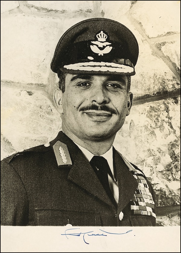 Two photos: matte-finish 6.5 x 9.5 of a younger King Hussein in full military uniform, signed in the lower border in blue ink; and a color glossy 6 x 8.25 photo of Princess Haya Bint al-Hussein, signed in black felt tip. In fine condition, with some light creasing to the king’s photo. R&R COA.