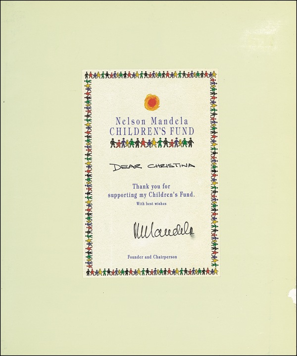 World-renowned civil rights leader (born 1918) who, in 1994, became the first black president of South Africa. From 1964 to 1990, Mandela was imprisoned for opposing South Africa’s white minority government and its policy of apartheid; in 1993, he won the Nobel Peace Prize. Signed book: Madiba: Nelson Rolihlahla Mandela, a Celebration. First edition. Sandton, South Africa: Martin Schneider & Company, 1997. Hardcover with dustjacket, 9.5 x 11.25, 145 pages. Signed in black ink on a specially printed bookplate affixed to the front free end page, “N. Mandela,” with the inscription “Dear Christina” added in another hand. In very good condition, with a hint of subtle wear and toning to jacket, smudge to last letter of signature, and a few spots of skinning and soiling to signed page and inside front cover. R&R COA.