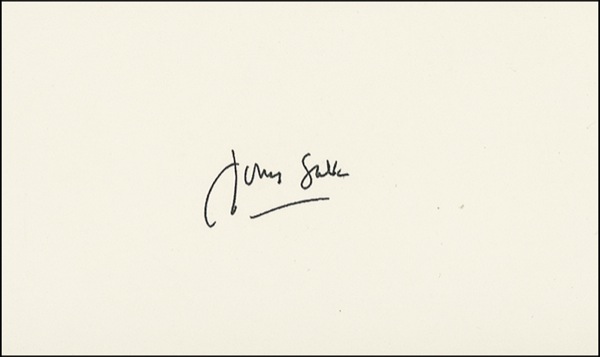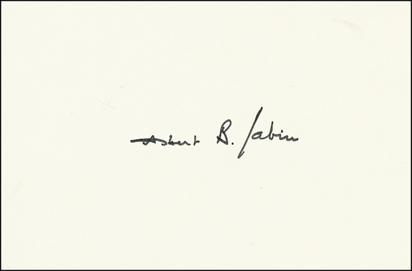 Codiscoverers and developers of the polio vaccine. Two black felt tip signatures, “Jonas Salk” and “Albert B. Sabin,” on individual off-white cards. In very fine condition. R&R COA.