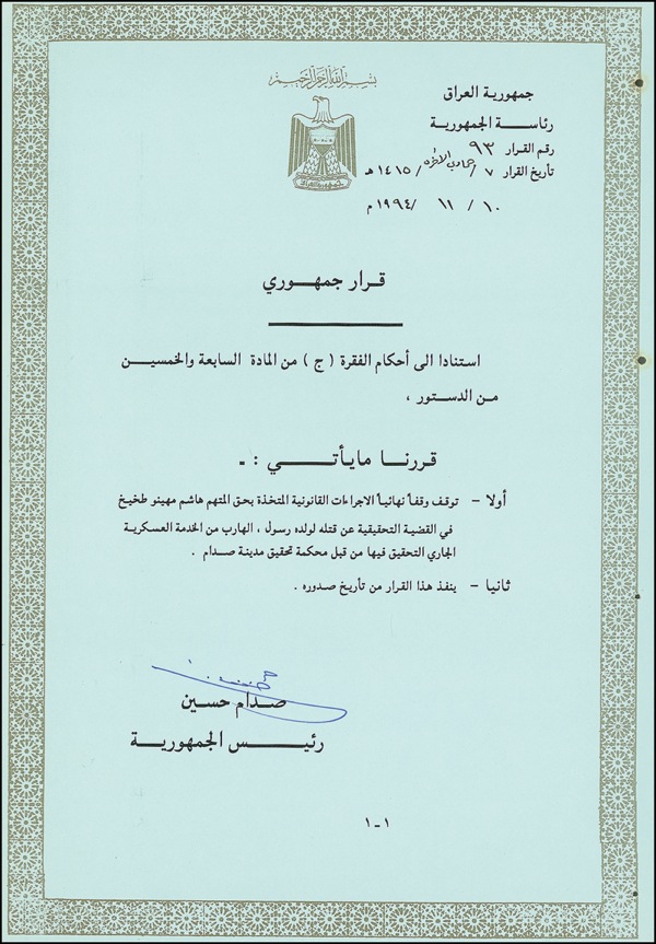 DS, in Arabic, one page, 8.25 x 12, circa 1993. An untranslated typed document bearing a printed eagle with shield device at the top the page. File holes to right margin, otherwise very fine condition. R&R COA.