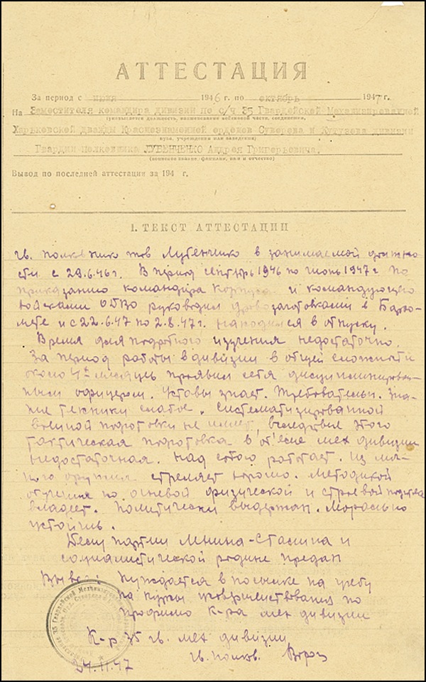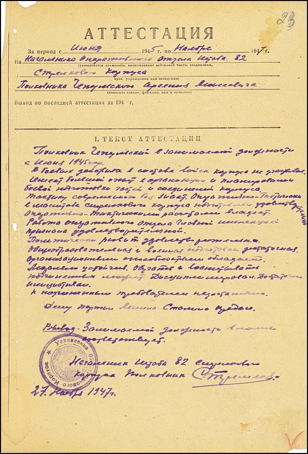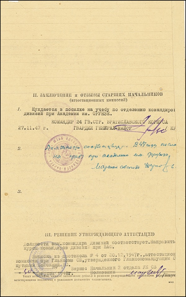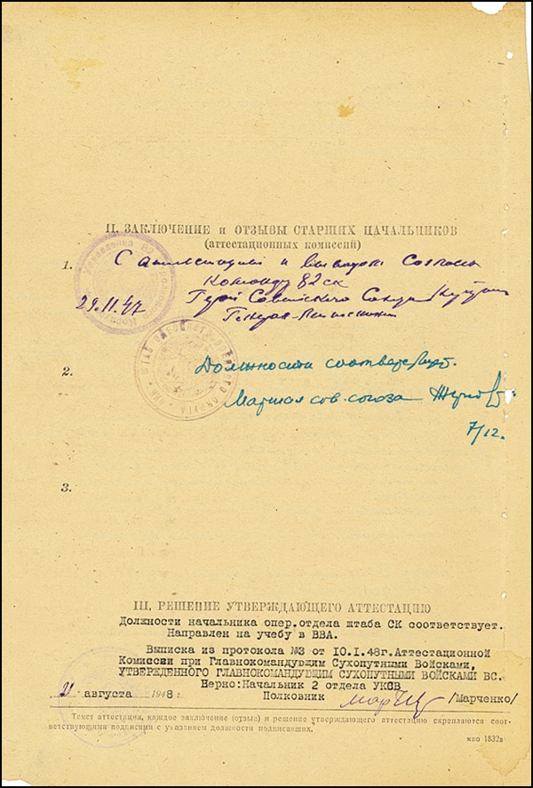Soviet general (1896–1974) who led the defeat of the Germans at Stalingrad and the entry into Berlin during World War II. Two DSs, 1947, each an official “attestation” signed by Zhukov and several others, Zhukov adding a brief additional notation to each. In very good condition, with mild toning, scattered handling wear, and a few small holes, chips, and tears. R&R COA.