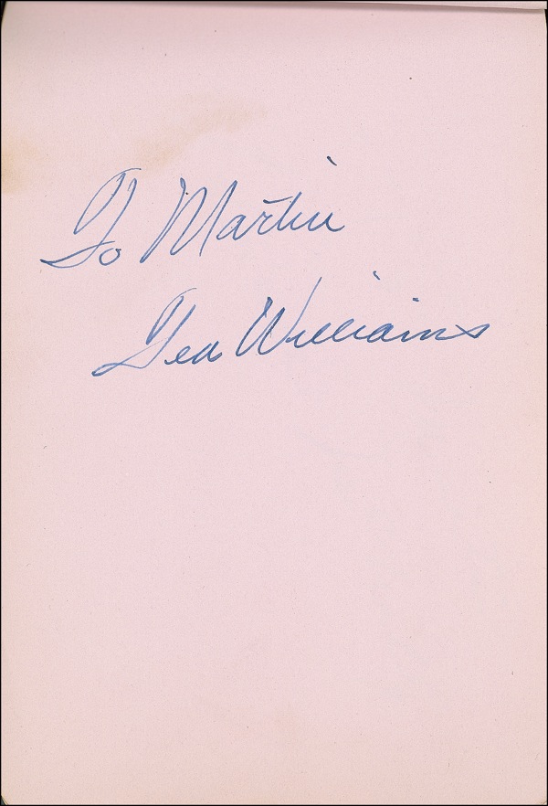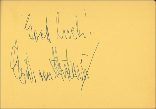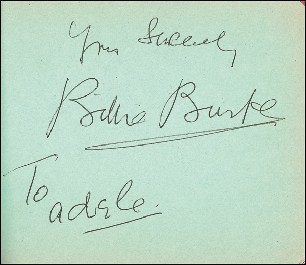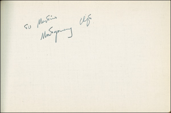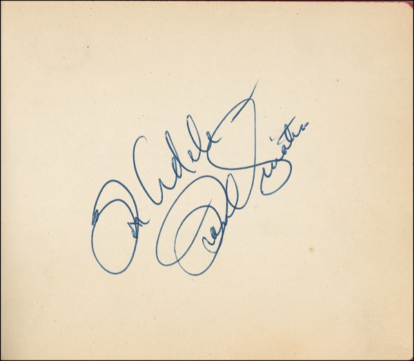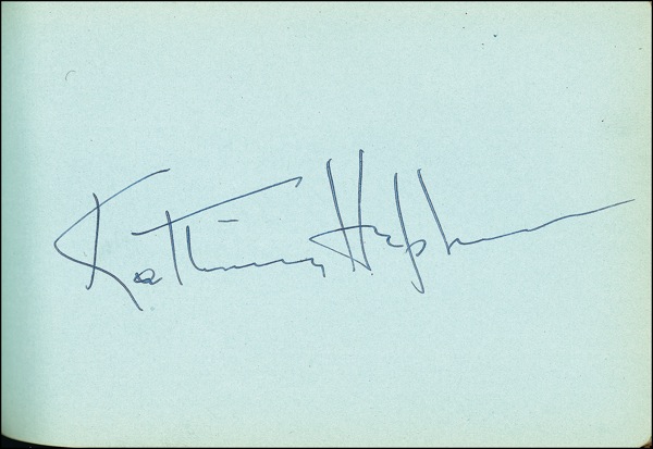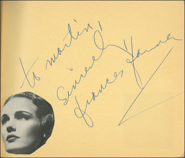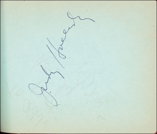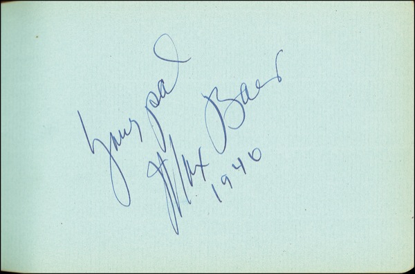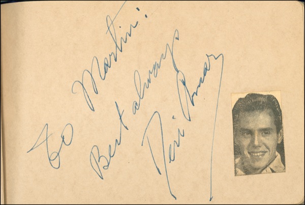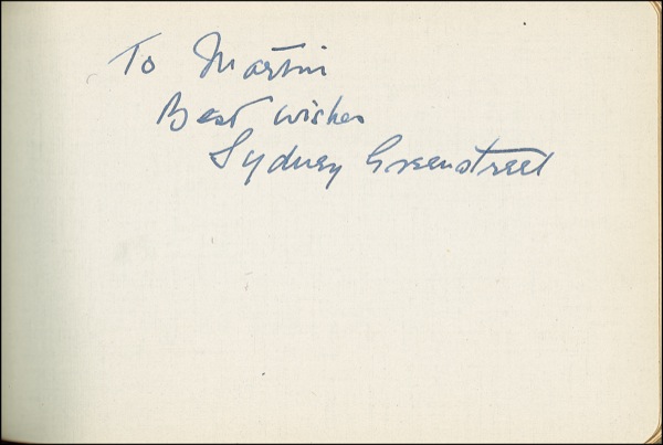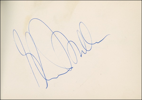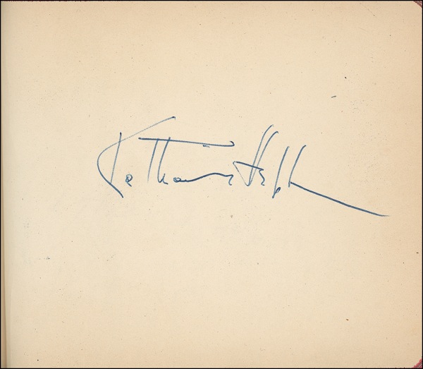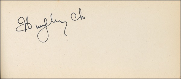 Impressive collection of approximately 950 vintage signatures contained within fourteen leatherbound autograph albums, aquired from the late 1930s to the 1950s. Most signatures are in fountain pen, with only a few in pencil. Many signatures are single-paged, with some back to back. Most are inscribed to Marty or Adele, with just a few signatures on affixed slips or cards. Albums were the property of a professional photographer named Martin Cohen, with several signers adding a reference to him making them look good and the remainder(later books) were collected by a lady named Elise who worked at Vendome in the deli. Signers include: Humphrey Bogart, Harold Lloyd, Bud Abbott and Lou Costello, Ted Williams, Jack Dempsey, Glenn Miller, Erich Von Stroheim, Montgomery Clift, Sydney Greenstreet, Bill Robinson (2), Billie Burke, Frank Sinatra, Judy Holliday, Paul Robeson, Desi Arnaz, Ronald Reagan, Katharine Heburn (2), Judy Garland, Basil Rathbone (2), Frances Farmer, Cole Porter, Max Baer, Bert Lahr (2), Edward VIII, and Errol Flynn. Other names include: Helen Hayes (3), Eddie Bracken, George Raft (3), Robert Shayne, Walter Huston, Ray Middleton, Alfred Lunt and Lynn Fontanne, Ethel Barrymore, Richard Whorf, Luther Adler, John Williams, Cedric Hardwicke, Sophie Tucker, Mary Martin, Victor Moore, Tamara, Lotte Lehman, Leif Erickson, Ann Penington, Fred Stone, Hume Cronyn, Eddie Albert (3), Nelson Eddy, Jeanette Macdonald, Jane Cowl, Lillian Gish, Jack Hawkins, Beatrice Lillie, Richard Hayden, Noel Coward, Phil Silvers (2), Erik Rhodes, Sabu, Paul Henried, Isobel Jewell, Miriam Hopkins, Bert Lytell, Victor Mature, Don Defore, Leon Ames, Sterling Hayden, Susanna Foster, Rex Ingram, Henry Armetta, Ethel Waters (2), Jimmy Durante, Ethel Merman (2), Barry Fitzgerald, Doug Corrigan, Mildred Natwick, Gertrude Lawrence, Natalie Schafer, Nancy Coleman, Ruth Cahtterton, Will Geer, Donald Cook, Burgess Meredith (2), Lee Patrick, Walter Abel, Arthur Fiedler (3), Van Heflin, Estelle Winwood, Maurice Evans, Elissa Landi, Lily Pons, Eddie O’brien, Huntz Hall, Gabriel Dell, Bernard Punsley, Keenan Wynn (3) , Jackie Gleason, Osa Johnson, Fred Waring, Horace Heidt, Art Carney, Bob Hope (4, One Is Pencil), Ruth Hussey, Anita Louise, William Holden (2), Lena Horne, Nelson D. Rockefeller, Rocky Graziano, Carol Channing, Rube Goldberg, Reginald Denny, Hedda Hopper, Adolph Green, Audrey Meadows, L(Aurence) Olivier, Lauren Bacall, Judith Anderson, Walter Winchell, Billy Gilbert, Jackie Cooper (2), Dean Martin (Pencil), Jerry Lewis (Pencil), Gene Lockhart, Edmund Gwenn, Alice Faye, Spike Jones, Gordon Macrae, Danny Kaye, Mervyn Leroy (2), Anthony Quinn (2), Oleson and Johnson, Jack Haley (2, One Signing “Como Tale Vous! Jacques Haley”), A[Lbert] Dekker, Johnny Weissmuller, Peter Lawford, Edmund Lowe, Bob Smith, Zachary Scott (2), Alan Ladd, Jerry Colonna, Edgar Bergen, Charlie Ruggles, Gene Autry, Margo, Peggy Ann Garner, Dave Garroway (3), Joe E. Brown (2), Henny Youngman (2), Dennis Morgan, Robert Mitchum, Hal Leroy, Fredric March (2), William Saroyan, Katherine Cornell (2), Francis Lederer, Eve Arden, Betty Grable, Paul Muni, Kay Kyser, Alison Skipworth, Simone Simon, Stepin Fetchit, Roland Young (2), Olin Howlin, Broderick Crawford, Herbert Hoover, Hank Greenberg, Marlene Dietrich, Elsa Lanchester, Louella Parson, Kitty Carlisle, Bing Crosby, Virginia Graham, Tyrone Power, Madeline Carroll, June Lockhart, Harry Richman, Virgil Thompson, Reginal Denny, Teresa Wright, Ralph Bellamy, Betty Furness (2), Nina Foch, Morton Downey, Kevin Mccarthy, Robert Montgomery, Alice Pearce, Arthur Treacher (2), Rudolf Friml, Katharine Cornell, Clifton Fadiman, Myrna Loy, Ricardo Cortez, Roddy Mcdowall, Diana Lynn, George Tobias, Halliwell Hobbs, Peggy Wood, Lillian and Dorothy Gish, Bob Feller, Fulton J. Sheen, Faye Emerson, James A. Farley, Celeste Holm, Nancy Olson, Janet Blair, Walter Slezak, Joan Blondell, Cesar Romero, Monte Blue, Jessica Tandy, Vera Zorina (2), Toby Wing, Clifton Webb, Lupe Velez, Helen Chandler, Dixie Dunbar, Mae West, Benny Goodman, Jane Wyatt, Lee J. Cobb, Franchot Tone, Robert Preston, Sheldon Leonard, Juhn Huston, Charley Chase, Jack Haley, Nita Naldi, Phyllis Thaxter, Ray and Gwen Bolger, Virginia O’brien, Marjorie Lord, Edward Everett Horton, Ilka Chase, Grace Moore, Alan Reed, Melville Cooper, Dinah Shore, Oscar Polk, Ramon Novarro, Fay Wray, Conrad Nagel, Laura Hope Crews, Paul Hartman, Raymond Massey, Dorothy Gish, Connie Boswell, Fifi D’orsay, Jack Teagarden, Ernest Truex, Ed Wynn, Gladys George, Joan Fontaine, Brian Aherne, James Dunn, Betty Hutton, Rags Ragland, Alan Napier, Vera-ellen, June Allsyon, Gloria Jean, Flora Robson, Isobel Elsom, Ruth Gordon, Dante, Kirk Alyn, Rosita Moreno, Eva Legallienne, [Carmen] Mir\a, Buddy Ebsen, Ben Blue, Ann Miller, Evelyn Venable, Monty Woolley, and Moss Hart. In fine overall condition, with expected light handling wear and some toning to affixed cards and slips. Large collection filled with recognizable names, with some great and well-known names in the entertainment, music and sports world. R&R COA.