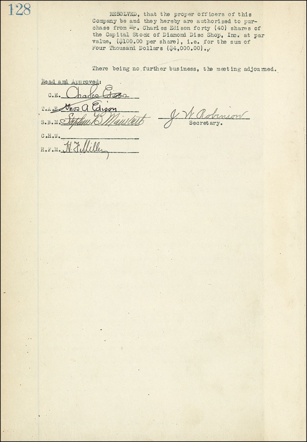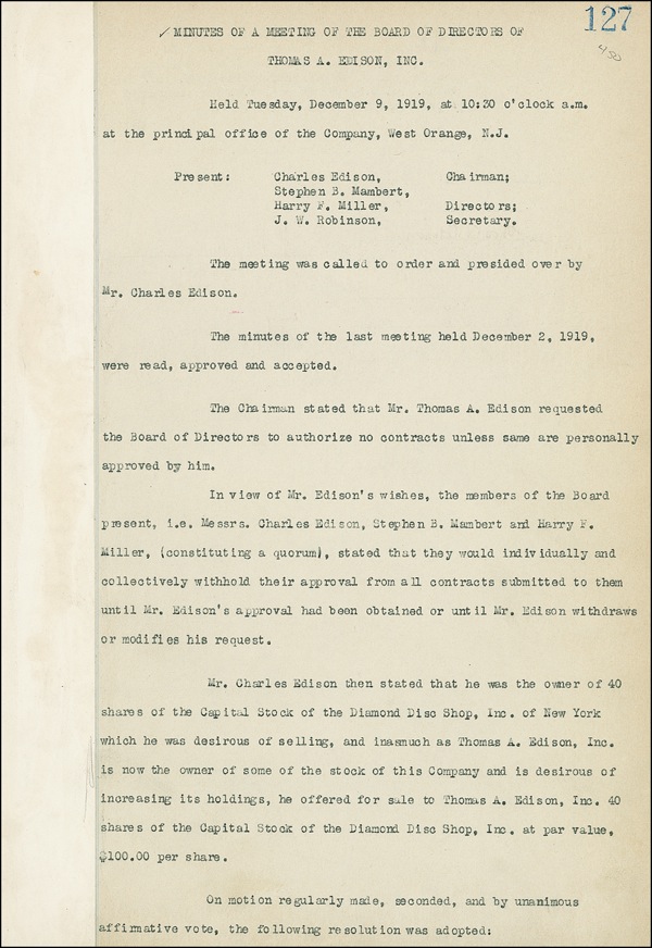 DS, signed “Thos. A. Edison,” one page both sides, 7.75 x 11, December 9, 1919. A copy of the minutes for a meeting of the Edison board of directors, specifying, among other matters, “In view of Mr. Edison’s wishes, the members of the Board present…stated that they would individually and collectively withhold their approval from all contracts submitted to them until Mr. Edison’s approval has been obtained or Mr. Edison withdraws or modifies the request.” Board also passed a resolution authorizing the officers to purchase stock in the Diamond Disc Shop, Inc. from Charles Edison. Signed on the reverse in black ink by Thomas Edison, as well as by Charles Edison and two other board members. Edison’s characteristic flourish going through Charles’ last name, a light shade of overall toning, and some light wrinkling from binding remnant affixed to front, otherwise fine condition. R&R COA.