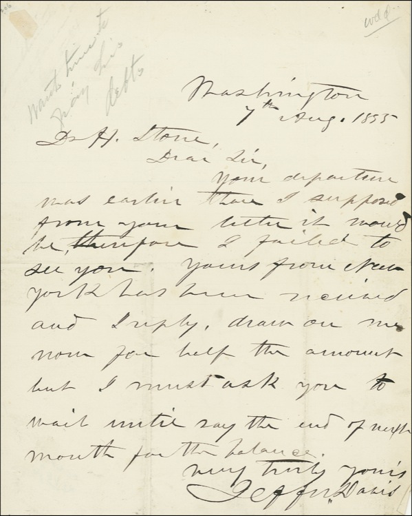 President of the Confederacy. ALS signed “Jeffer. Davis,” one page, 8 x 9.75, August 7, 1855. Letter regarding his financial obligation to Dr. H. Stone. In full, “Your departure was earlier than I supposed from your letter it would be, therefore I failed to see you. Yours from New York has been received and I reply, draw on me now for half the amount but I must ask you to wait until say the end of the month for the balance.” In very good condition, with intersecting folds, several pencil notations to top and a bit of light soiling. Auction LOA John Reznikoff/PSA/DNA and R&R COA.