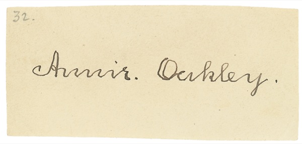 Celebrated American performer (1860–1926) whose legendary prowess as a markswoman earned her worldwide renown. At the tender age of fifteen, she bested vaudeville marksman Frank E. Butler in a shooting match; the two were later married and toured together as star attractions in Buffalo Bill’s Wild West Show. She never failed to delight her audiences. Among other astounding sharpshooting feats, Oakley would, from thirty paces, split a playing card held edge-on; on one occasion, performing in Berlin, she shot a cigarette from the lips of Kaiser Wilhelm II. Bold ink signature, “Annie Oakley,” on 3.5 x 1.75 slip. In fine condition. Auction LOA John Reznikoff/PSA/DNA and R&R COA.