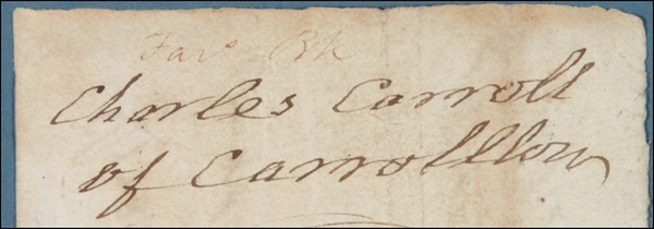 Signer of the Declaration of Independence from Maryland (1737–1832) who was the last survivor among his colleagues. Ink endorsement, “Charles Carroll of Carrollton,” on the reverse of a 7.5 x 2.75 check made out to him by Richard Caton for $1383.95 on May 22, 1819. Matted and framed (so that both sides are visible) with a portrait and engraved plaque to an overall size of 14 x 14. In very good condition, with scattered soiling and light toning, and creases (two vertical creases through signature). The signature is otherwise clear and dark. Auction LOA John Reznikoff/PSA/DNA and R&R COA.