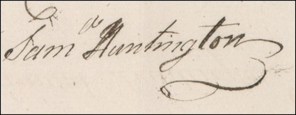 Signer of the Declaration of Independence from Connecticut (1731–1796) and seventh President of the Continental Congress. DS, signed “Receiv’d. the contents, pr. Saml. Huntington,” one page, 7.5 x 12.75, August 1777. A detailed receipt for payments made to Huntington by the State of Connecticut for service and expenses related to “Attending the Committee at Springfield.” Matted and framed with a portrait and engraved plaque to an overall size of 20 x 19.5. Faint show-through from docketing to reverse and two faint vertical folds touching Huntington’s writing, otherwise fine, bright condition. Auction LOA John Reznikoff/PSA/DNA and R&R COA.