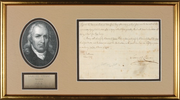Signer of the Declaration of Independence from Maryland (1741–1811) and Associate Justice of the Supreme Court from 1796 until his death. DS, three pages on two adjoining 9.25 x 14.25 sheets, June 2, 1787. A manuscript legal document related to the settlement of the estate of Joseph Nicholson, which had evidently led to a heated dispute among the decedent’s heirs. Matted and framed (the final page visible only) with a portrait and engraved plaque to an overall size of 20.25 x 11.25. In very good condition, with folds (partial separations touching a few words of the text), light toning and scattered soiling (slightly touching signature), light spots and stains, folds and wrinkling, and edge wear with a few small chips and tears. The signature is otherwise dark and clear. Auction LOA John Reznikoff/PSA/DNA and R&R COA.