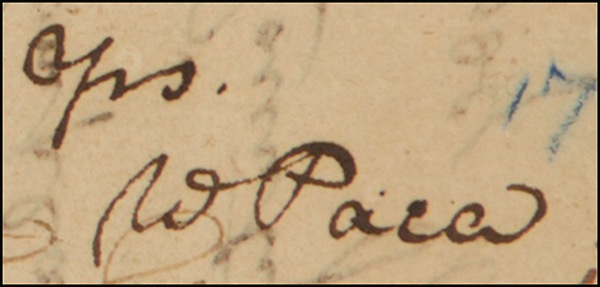 Signer of the Declaration of Independence from Maryland (1740–1799). ADS, signed “W. Paca,” 3.5 x 4.5, February 4, 1768. A handwritten legal document related to the case Michael Miller vs Joseph Perry, reading, in part: “File this bill & issue subpoena as granted by his Exlly.” Matted and framed with a portrait and engraved plaque to an overall size of 15 x 14. In good to very good condition, with toning, a few creases (away from signature), small holes at upper right, and show-through from writing on reverse visible behind signature. The writing is dark throughout. In his 1995 reference History Comes to Life, Kenneth Rendell places Paca’s autograph material into the “rare” category among the Signers. Auction LOA John Reznikoff/PSA/DNA and R&R COA.