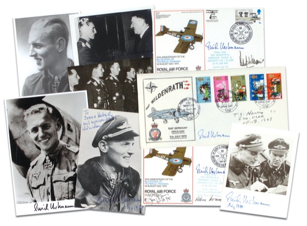 Ten items: seven signed photos of Hartmann from throughout his military career, ranging in size from 4 x 5 up to 5 x 7, each signed in ink or felt tip by Hartmann, who adds an inscription to one; a clipped return address, signed “E. Hartmann,” and his mailing address on an off-white slip; two identical flight-flown commemorative covers, each signed in blue ink by Hartmann and each signed by three others, including Oskar Romm; and a commemorative cover signed in blue ink. In fine condition. R&R COA.