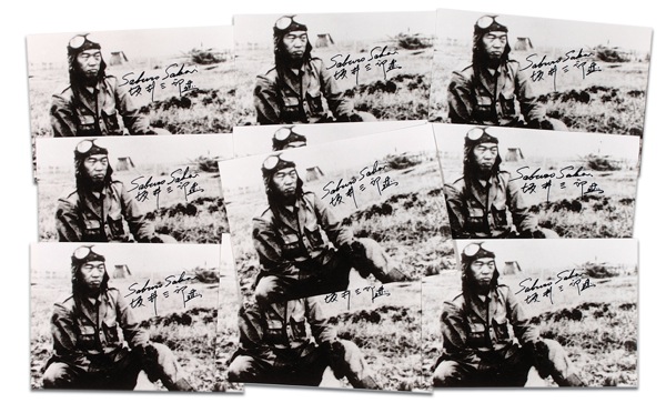 Japan’s leading air ace during WWII (1916–2000), with 64 kills. Ten identical glossy 6 x 4 photos of Sakai sitting on the airfield in his flight gear, each signed in black felt tip in English and Japanese. In very fine condition. R&R COA.