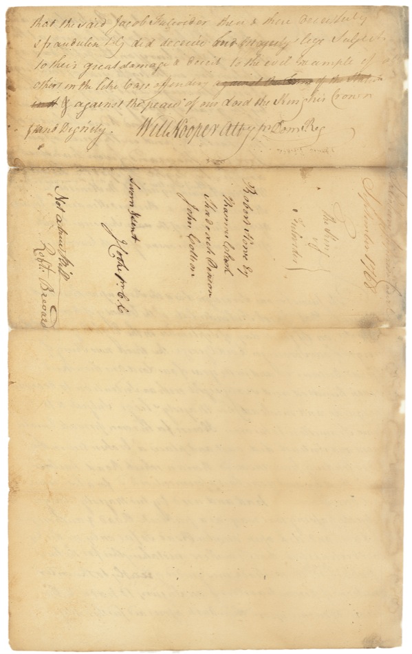 Signer of the Declaration of Independence from North Carolina (1742–1790). DS, signed “Will. Hooper Atty.,” one page both sides, 7.5 x 12.5, September 5, 1768. A legal document reporting a ruling of the Salisbury Superior Court. In part: “The jurors for our Sovereign Lord the King upon their Oath present that Jacob Fulwider late of the County of Rowan planter … with an Intention to deceive misguide and mislead his Majesty’s liege Subjects & to draw Travellers to his own House for his own private Emolument and Interest did cast and place a broken tree in the Road leading from Anson to Rowan which Road has … for a long time past been travelled … as a publick Road & authorized by Law and did open another Road … that Travellers mistaking this for the true & publick Road were mislead … greatly to the interruption of persons travelling, an Injury to trade….” In very good condition, with light scattered staining and soiling, chips and slight trimming to left margin (adhesive tape reinforcement), short partial separations at folds, and faint show-through of ink (subtly visible behind signature). The signature is clear, bold, and otherwise unaffected. In his 1995 reference History Comes to Life, Kenneth Rendell places Hooper’s autograph material into the “very rare” category among the Signers—an echelon second only to that occupied by the virtually unobtainable Gwinnett and Lynch. Auction LOA John Reznikoff/PSA/DNA and R&R COA.