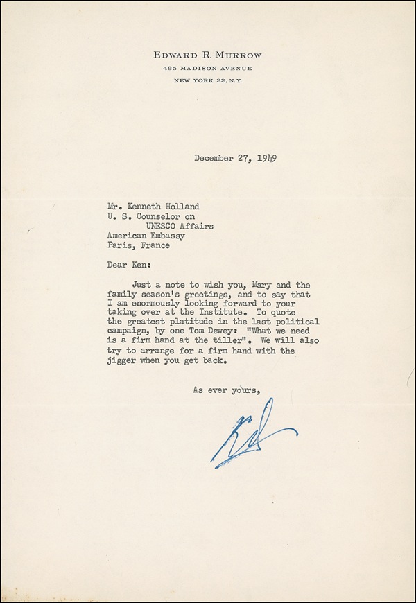 Famed American journalist (1908–1965) best known for his wartime broadcasts from London and his widely respected CBS television news shows See It Now and Person to Person. His role in exposing the hypocrisy of Red-baiting Senator Joseph McCarthy was dramatized in the acclaimed 2005 film Good Night, and Good Luck. TLS signed “Ed,” one page, 7.25 x 10.5, December 27, 1949. Murrow writes to Kenneth Holland at the American Embassy in Paris. In part: “I am looking forward to your taking over at the Institute. To quote the greatest platitude in the last political campaign, by one Tom Dewey: ‘What we need is a firm hand at the tiller.’ We will also try to arrange for a firm hand with the jigger when you get back.” Small spot of soiling to bottom edge, otherwise fine, clean condition. R&R COA.