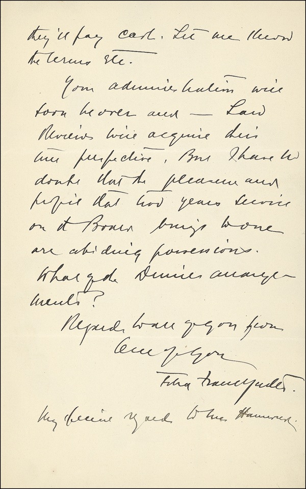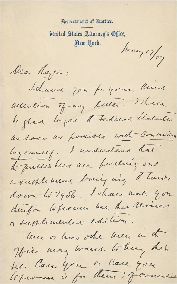 Associate Justice of the U. S. Supreme Court from 1939 to 1962. ALS, two pages on two adjoining sheets, 5 x 8, Department of Justice letterhead, May 17, 1907. In full, “Thank you for your kind attention of my letter. I shall be glad to get a Federal Statutes as soon as possible with convenience to yourself. I understand that the publishers are finishing out a supplement bringing it laws down to 1906. I shall ask you therefore to procure me this revised or supplemented edition. One or two other men in the office may want to buy this set. Can you or care you to procur it for them; of course they'll pay cash. Let me know the terms etc. Your administration will soon be over and - Law Review's will acquire their true perspective. But I have to doubt that the pleasure and profit that two years service on the Board brings to one are abiding possessions. What of the service arrangements?.” In fine condition, with a couple light creases. R&R COA.