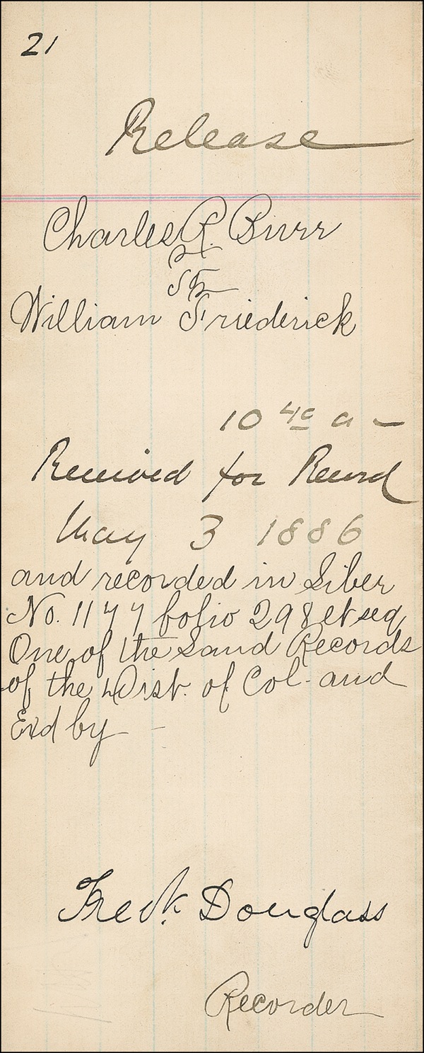 Former slave who lent his eloquently powerful voice to the abolitionist movement. DS, signed “Fredk. Douglass,” two pages, 8 x 12.5, May 3, 1886. Legal document of a financial nature between Charles Burr and William Friederick, signed on the docket by Douglass as the recorder. In fine condition, with expected folds and a light shade of toning. R&R COA.