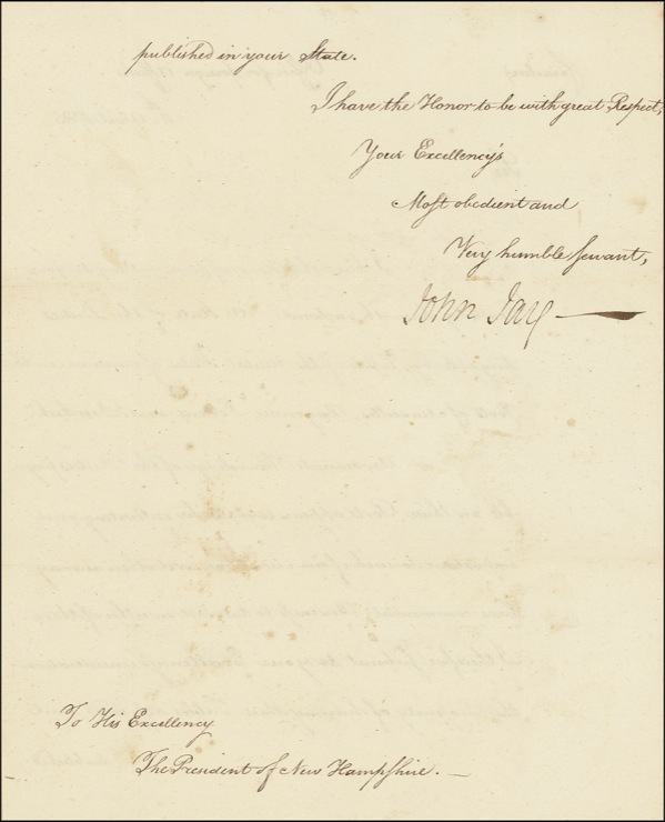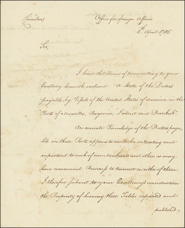 Circular LS, one page both sides, 7.25 x 9, April 11, 1785. Circular sent from the Office for Foreign Affairs to the President of New Hampshire, regarding ships’ duties. In part, “I have the honor of transmitting…’A State of the Duties payable by Vessels of the United States of America in the Ports of Marseilles, Bayonne, Louient and Dunkirk.’ An accurate knowledge of the Duties payable in those Ports appears to me to be interesting and important to such of our merchants and others as may have commercial business to transact in either of them.” In very good condition, with several intersecting folds, scattered light staining, and an inexplicable rectangular area above body of text on first page, possibly a professional repair. Auction LOA John Reznikoff/PSA/DNA and R&R COA.