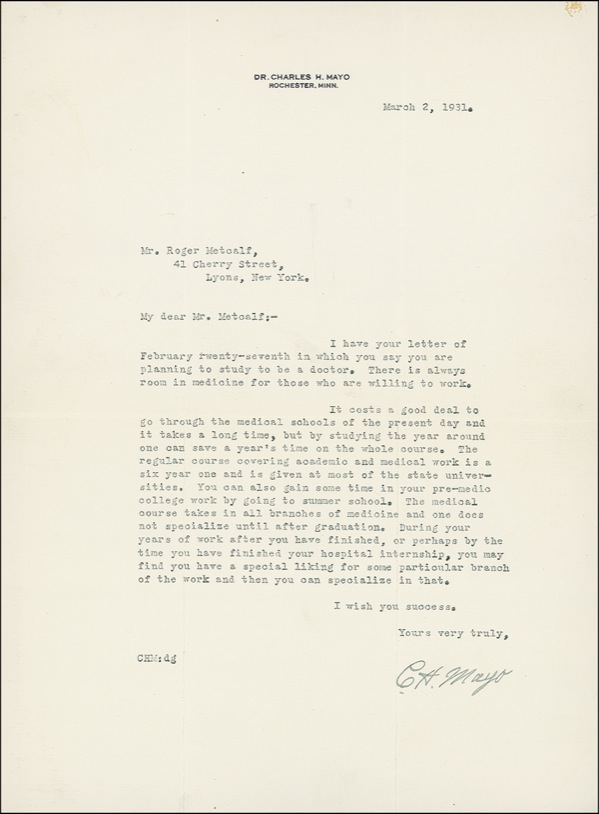Co-founder, with his brother William, of the Mayo Clinic. TLS signed “C. H. Mayo,” one page, 8 x 10.5, personal letterhead, March 2, 1931. A letter to Roger Metcalf, who had expressed interest in becoming a doctor. In part: “There is always room in medicine for those who are willing to work. It costs a good deal to go through the medical schools of the present day one can save a year’s time on the whole course…. The medical course takes in all branches of medicine and one does not specialize until after graduation. During your years of work after you have finished, or perhaps by the time you have finished your hospital internship, you may find you have a special liking for some particular branch of the work and then you can specialize in that.” In fine condition, with intersecting mailing folds, one along first initial. R&R COA.