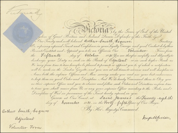 Monarch of Queen of Great Britain and Ireland (1819–1901) from 1837 until her death. Her reign of more than 63 years remains unmatched in the history of Great Britain and places her among the most durable monarchs of any nation in modern times. The unprecedented growth and prosperity of the British Empire under her rule—as well as a strangely prescient public fascination with the queen and her family—made her one of the most celebrated public figures of her day, and her name would become synonymous with an entire age. Partially printed DS, signed “Victoria R,” one page, 15.75 x 11.75, November 28, 1881. A commission for Arthur Smith as adjutant in the Volunteer Forces. The embossed wax and paper seal remains intact at upper left. In very good condition, with vertical folds (partial separations touching text), light soiling, and a few small spots (one tiny spot just touching “R”). R&R COA.