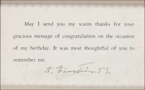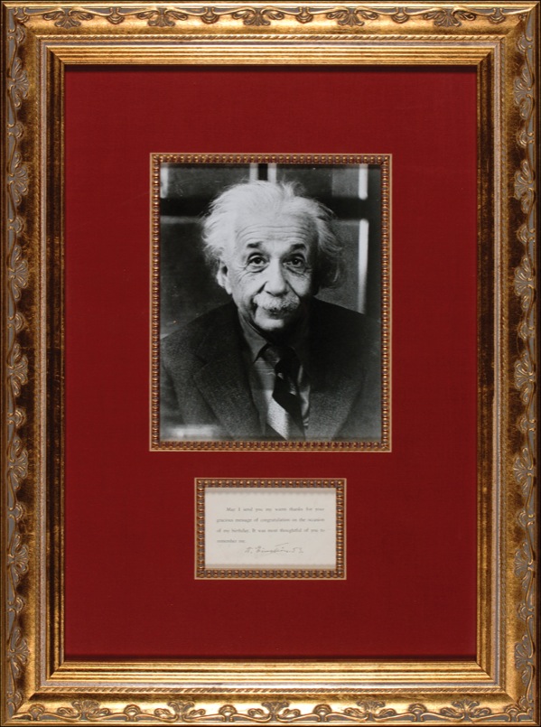 Printed card with a message of thanks, “May I send you my warm thanks for your gracious message of congratulation on the occasion of my birthday. It was most thoughtful of you to remember me,” 4 x 2.5, signed in fountain pen, “A. Einstein 53.” Attractively matted and framed with an unsigned photo to an overall size of 16.5 x 22.5. In fine condition, with a touch of mild scattered soiling. Auction LOA John Reznikoff/PSA/DNA and R&R COA.