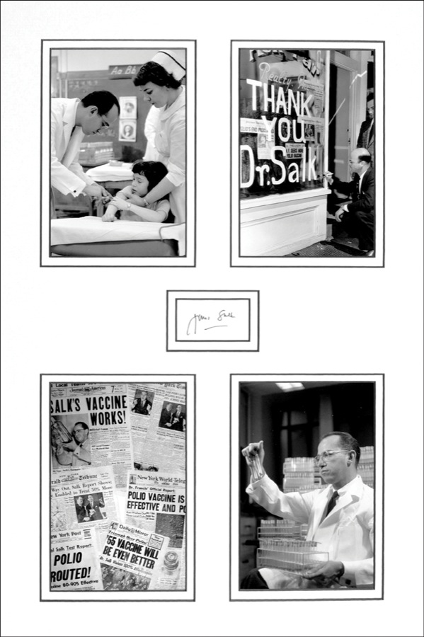 Codiscoverer of the polio vaccine (1914–1995). Felt tip signature, “Jonas Salk,” on a white 2 x 1 card. Matted with four unsigned photos to an overall size of 12 x 18. In fine condition. R&R COA.