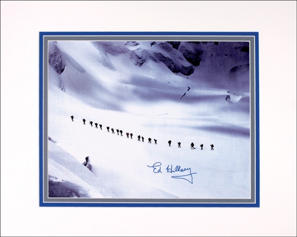 Color satin-finish 13.5 x 10.25 photo of the Everest expedition, signed in blue felt tip “Ed Hillary.” In very fine condition. R&R COA.