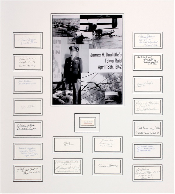 Nineteen ink and felt tip signatures of members of Doolittle’s Raiders on individual white cards, many signers also adding their respective rank. Represented: Jim Doolittle, Tom Griffin, Chase Nielsen, Jacob DeShazer, Edgar McElroy, Charles Ozuk, Frank Kappeler, J. R. Stork, R. E. Cole, William Birch, Horace Crouch, Travis Hoover, Ed Horton, David Thatcher, Bill Bower, Nolan Herndon, Edward Saylor, Robert Hite and Davy Jones. Matted with a photo to an overall size of 27 x 30. In fine, clean condition. R&R COA. Oversized.