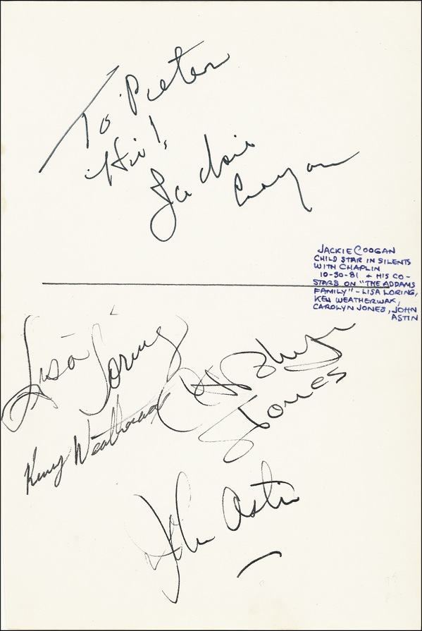 Ink signatures of John Astin, Lisa Loring, Carolyn Jones, Ken Weatherwax, and Jackie Coogan, who adds a brief inscription on an off-white 5.5 x 8 album page. Consignor notes that page was originally taken from one of four albums of an ABC Television executive. In fine condition, with collector’s notation to right edge. R&R COA.