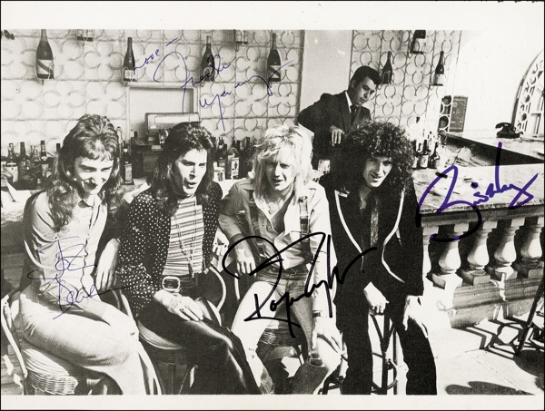Early 11 x 8.5 book photo of the band sitting at a bar, signed in blue ink by Freddie Mercury and John Deacon, in blue felt tip by Brian May, and in black felt tip by Roger Taylor. In fine condition, with a rough top edge. COA Roger Epperson/REAL and R&R COA.