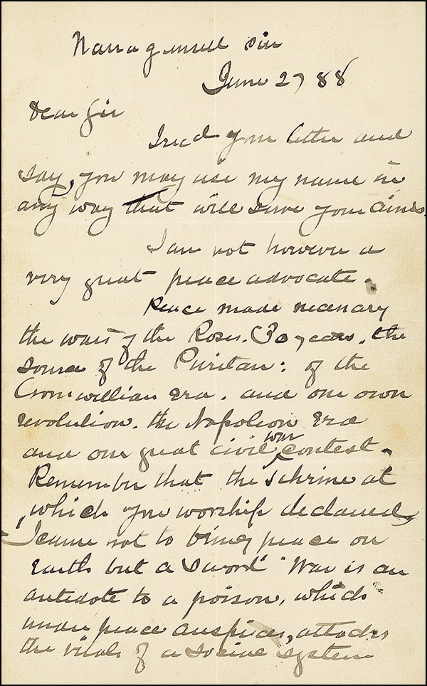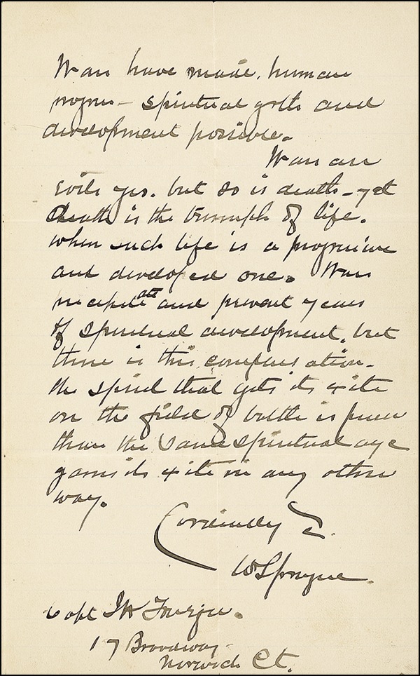 Governor of the state of Rhode Island from 1860-1863, and U.S. Senator from 1863-1875. He participated in the First Battle of Bull Run during the American Civil War. ALS signed “W. Sprague,” two pages on two adjoining sheets, 5 x 8, June 17, 1888. Letter to a gentleman in Connecticut. Intersecting folds, a bit of scattered light toning and a couple pencil notations to edges, otherwise fine condition. R&R COA.