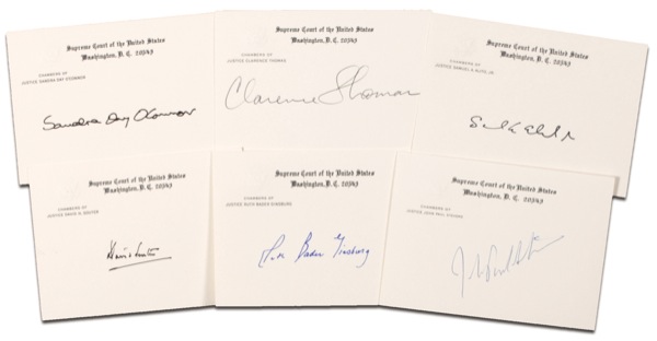 Six signed Supreme Court chamber cards, 5 x 3.5, each signed in ink or ballpoint by a different Justice. Signers are: Sandra Day O’Connor, John Paul Stevens, Clarence Thomas, David Souter, Samuel Alito, and Ruth Bader Ginsburg. In very fine condition. R&R COA.