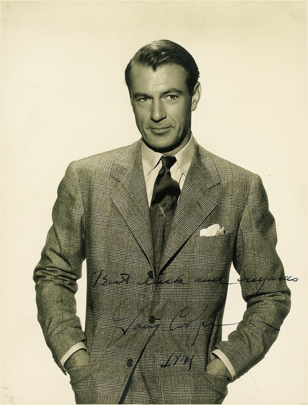 Handsome vintage matte-finish 7.25 x 9.5 photo of Cooper in a three-piece suit, signed in fountain pen, “Best wishes and regards, Gary Cooper 1941.” In fine condition, with lightly trimmed edges, and just a bit of light contrast to signature and sentiment. R&R COA.