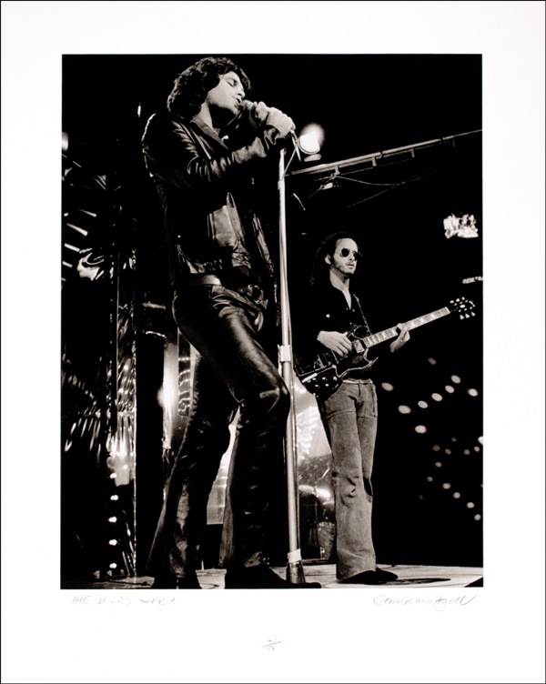 Limited edition photo of Jim Morrison and Robby Krieger on stage with the Doors in 1968 on a 16 x 20 sheet of Kodak’s highest quality Silver Gelatin paper, #43/50, signed in pencil along the bottom by Wentzell. In very fine condition. R&R COA.