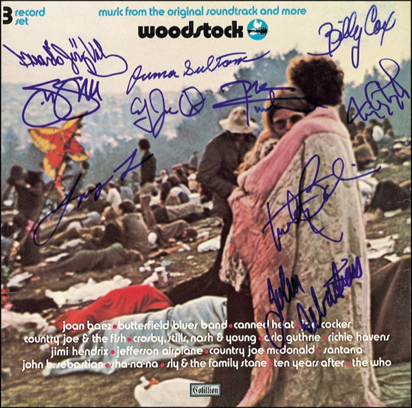 Woodstock soundtrack album signed on the front cover in felt tip by ten participants: Pete Townshend, Billy Cox, Steven Stills, John Sebastian, Country Joe McDonald, Marty Balin, Larry Lee, Juma Sultan, Gerardo Velez, and Tom Constanten. In fine condition, with a few small surface creases, and some light brushing to a few signatures. The record is not included. R&R COA.