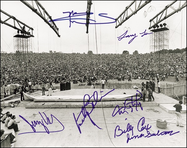 Glossy 14 x 11 panoramic photo of the view from the Woodstock stage, signed in blue felt tip by seven performers: Pete Townshend, Marty Balin, Billy Cox, Larry Lee, Juma Sultan, Jerry Velez, and Tom Constanten. In very fine condition. R&R COA.