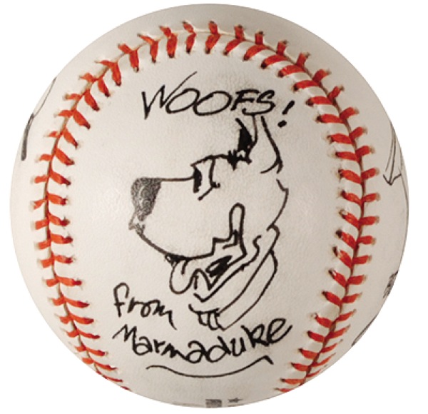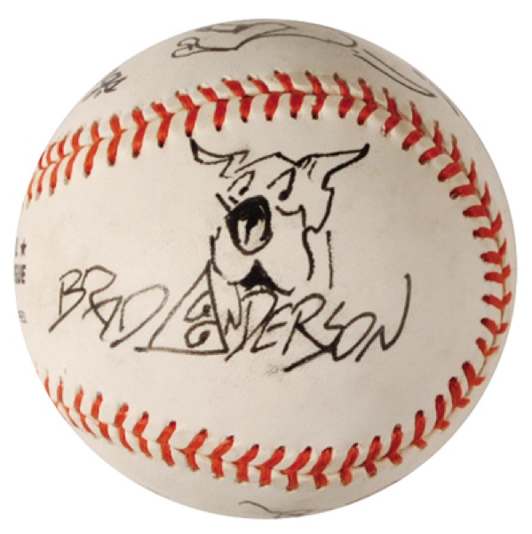 Two official Rawlings American League Cal Ripken, Jr. commemorative baseballs, each signed in ballpoint by Anderson, who has added four Marmaduke sketches to each ball, all on the side panels. In fine condition, with a bit of scattered light soiling. R&R COA.