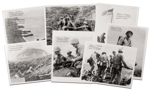 Last undisputed survivor (1920–2007) of the iconic flag-raisings on Iwo Jima in 1945. Seven satin-finish 8 x 10 and 10 x 8, each signed in felt tip “Charles W. Lindberg,” LIndberg adding to six “1st Flag Raiser, Iwo Jima, Feb. 23, 1945, 10:30 A.M.” One photo is additionally signed “John K. Wells, C.O. 3rd Platoon, Co. ‘E’ 2nd Bat. 28th Marines, 5th Marine Div. ‘Iwo Jima,’ Feb.–Mar. 1945.” In very fine condition. R&R COA.