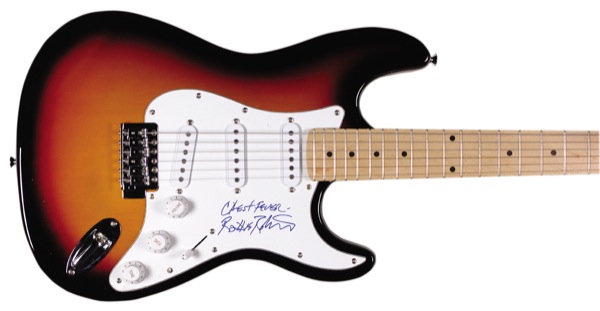 Sunburst-finish California ‘stratocaster-style’ electric guitar, signed on the white pickguard in blue felt tip by Robertson, adding “Chest Fever” above his signature. In fine condition. R&R COA. Oversized.